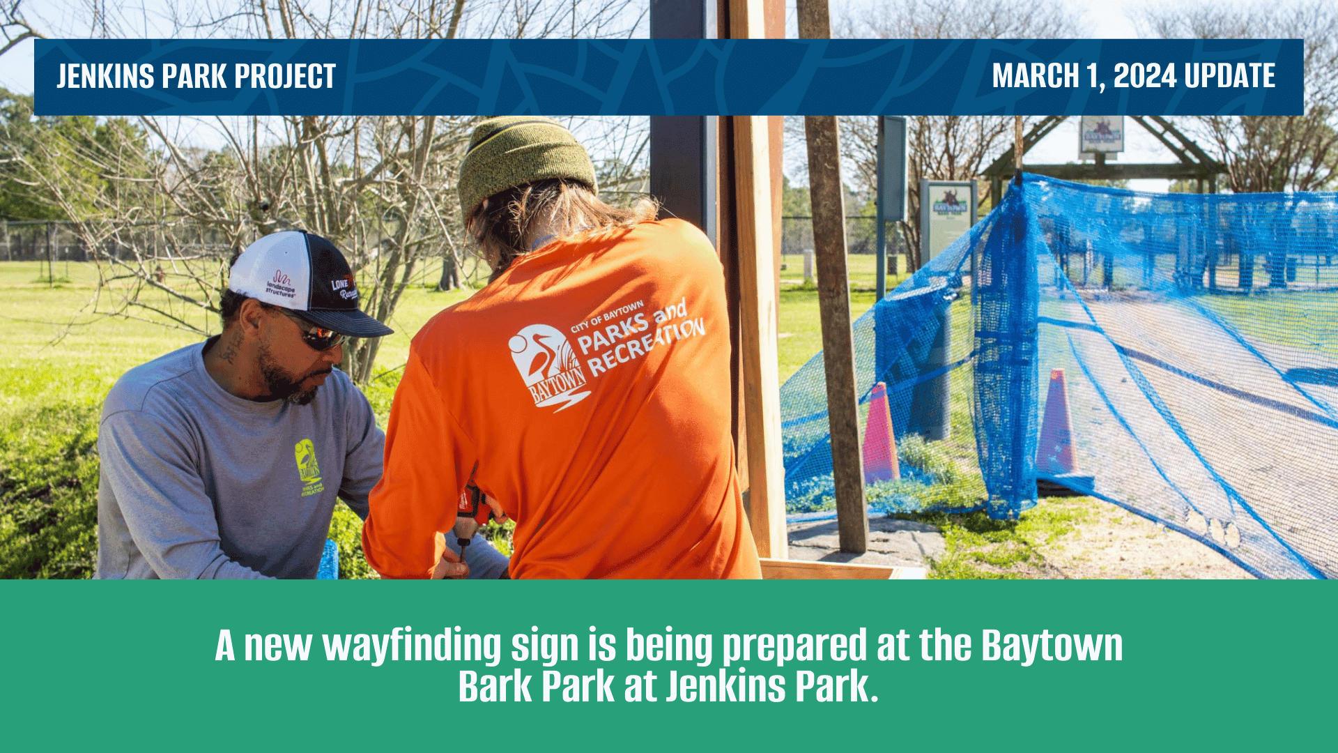 A new wayfinding sign is being prepared at the Baytown Bark Park at Jenkins Park.